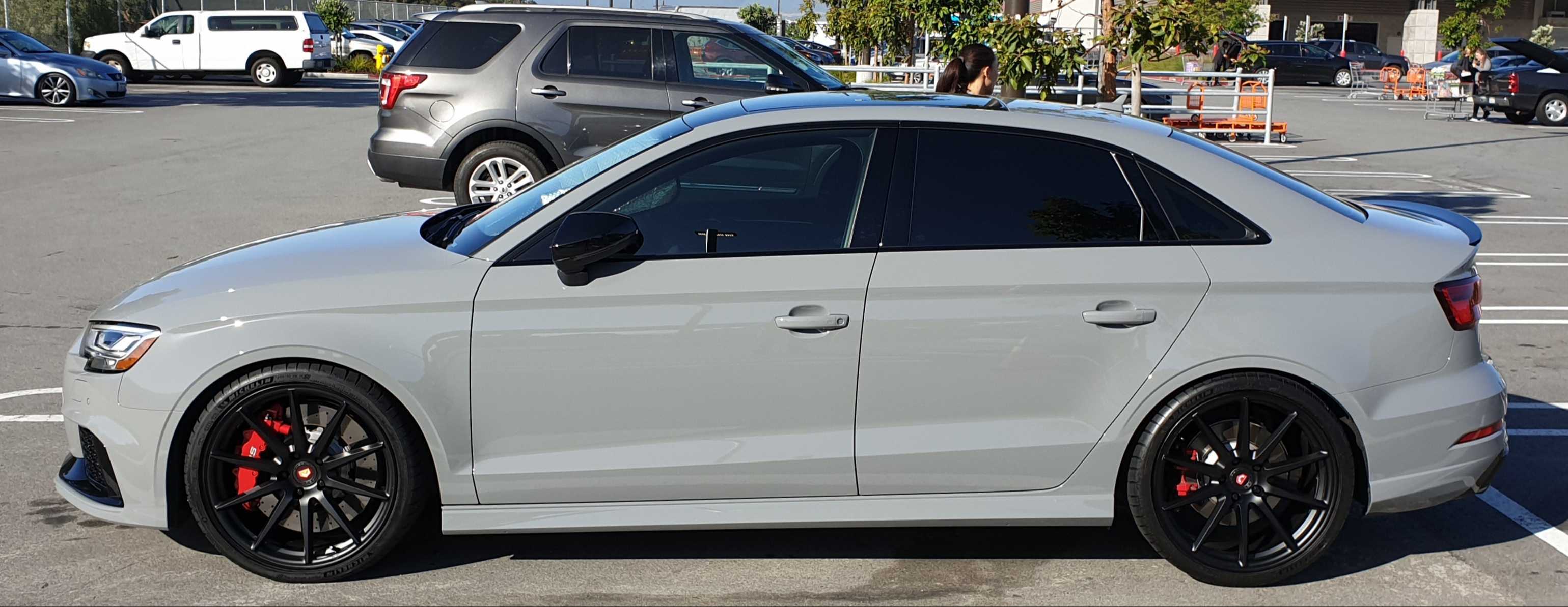 This Grey Audi RS3 8V Sedan is running 19×9-inch Vossen VPS-310 wheels finished in Satin Black. Paired with 255/35-19 tires. Suspension is H&R VTF coilovers.