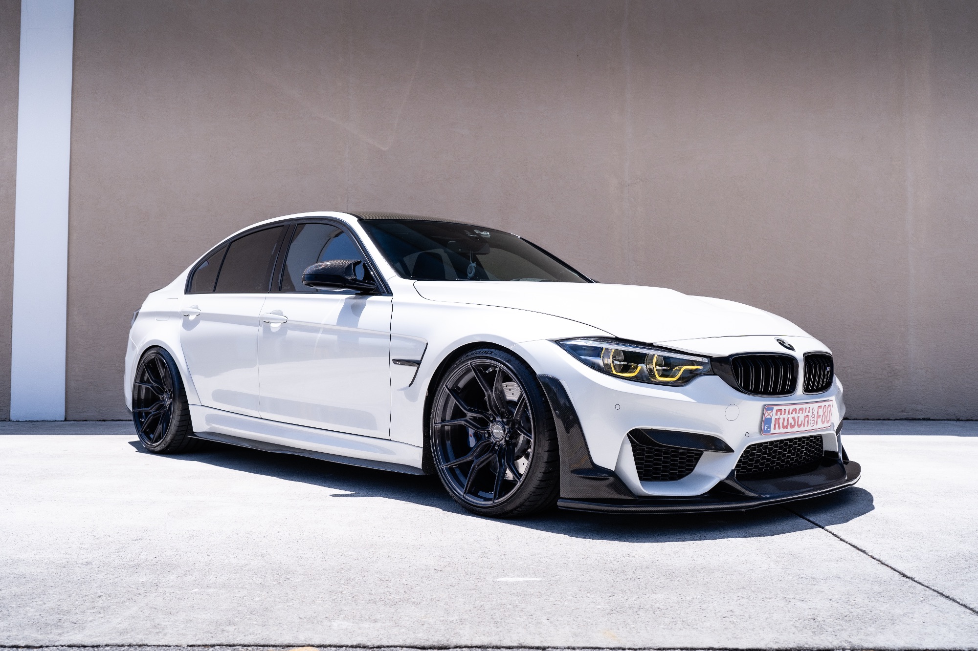 This White BMW M3 F80 is running 20×9.5 20×11.5-inch Rusch GTX-R wheels finished in Dark brushed black. Paired with 255/30/20 305/25/20 tires. Suspension is Springs lowering.