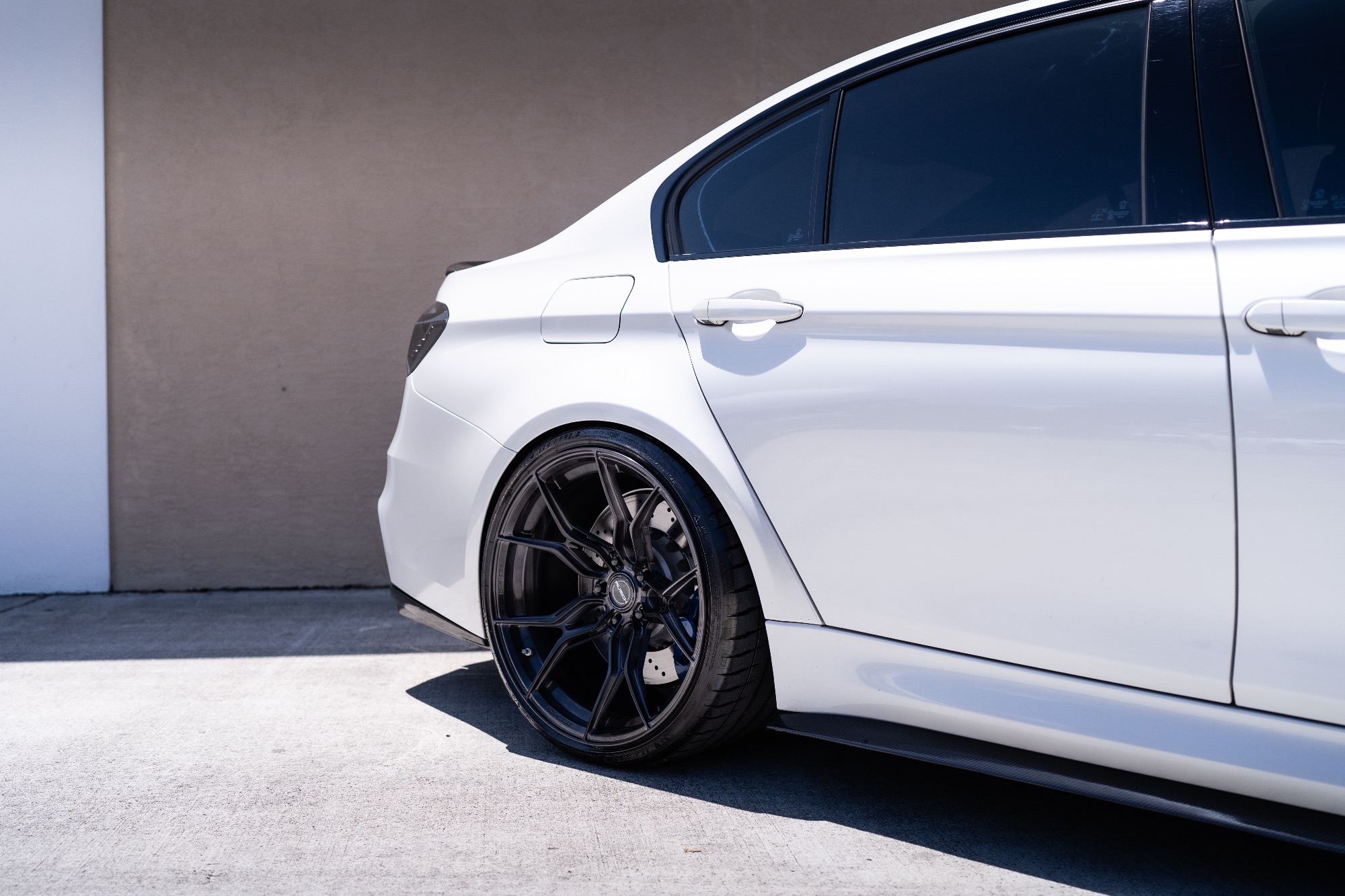 This White BMW M3 F80 is running 20×9.5 20×11.5-inch Rusch GTX-R wheels finished in Dark brushed black. Paired with 255/30/20 305/25/20 tires. Suspension is Lowered.