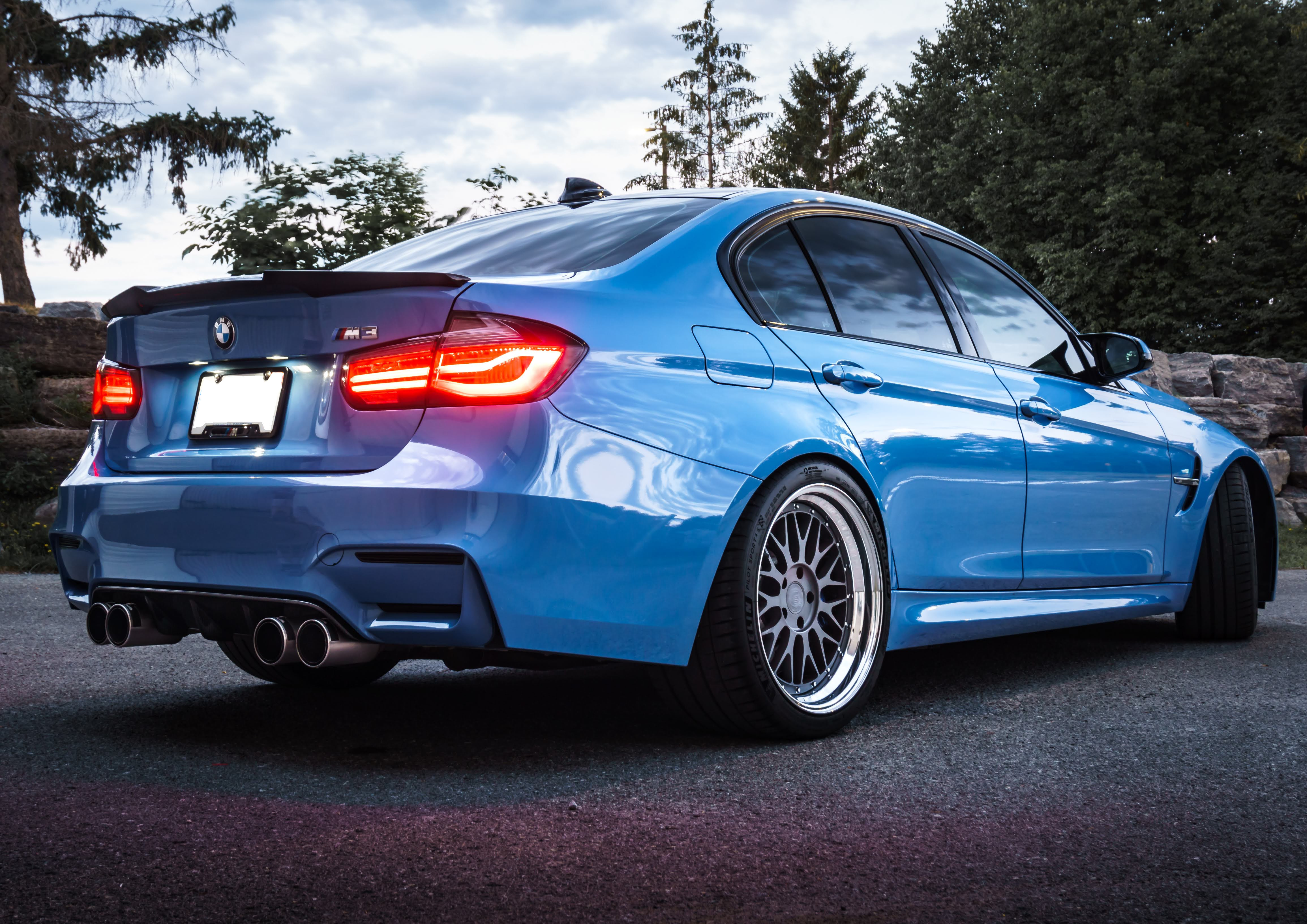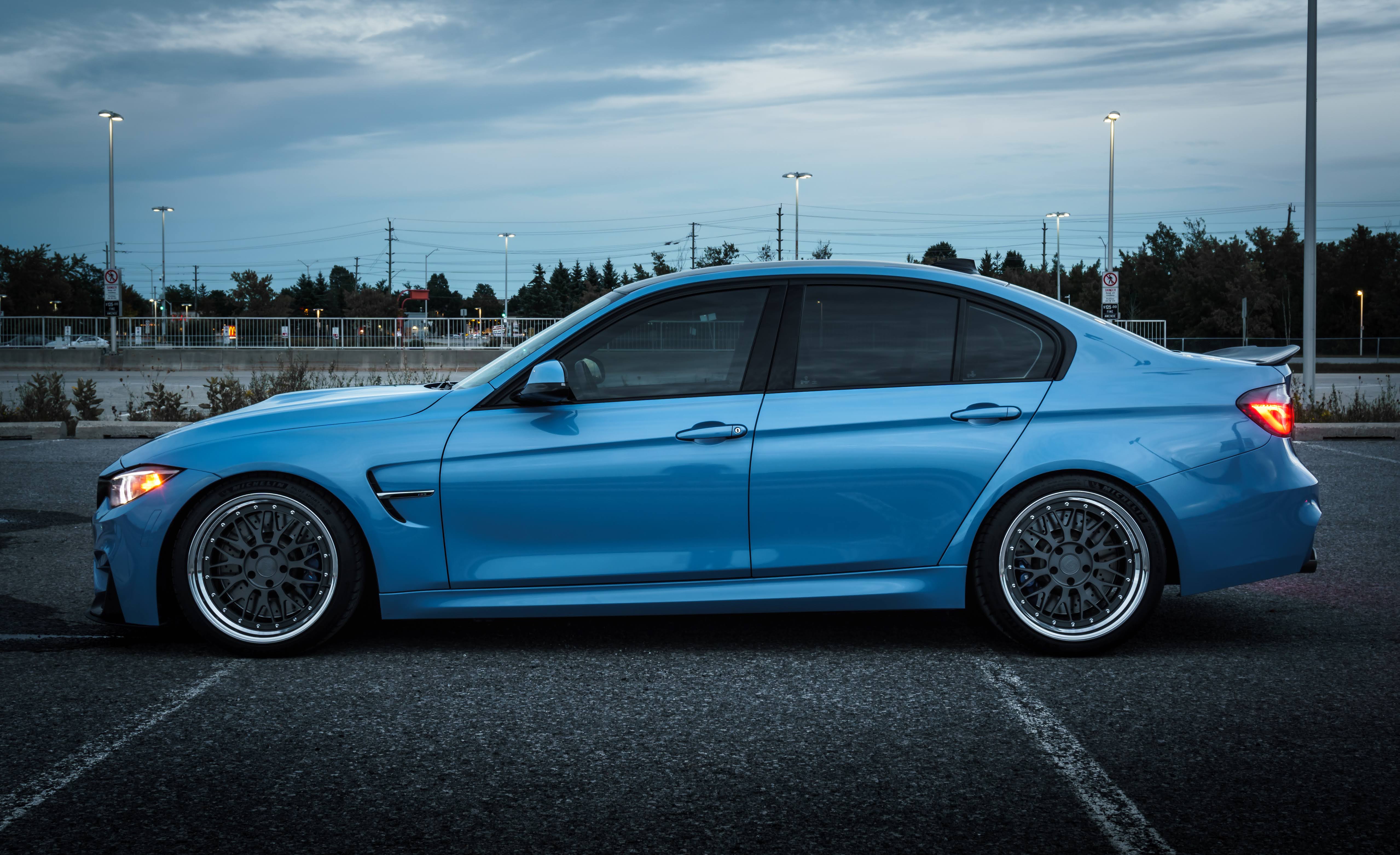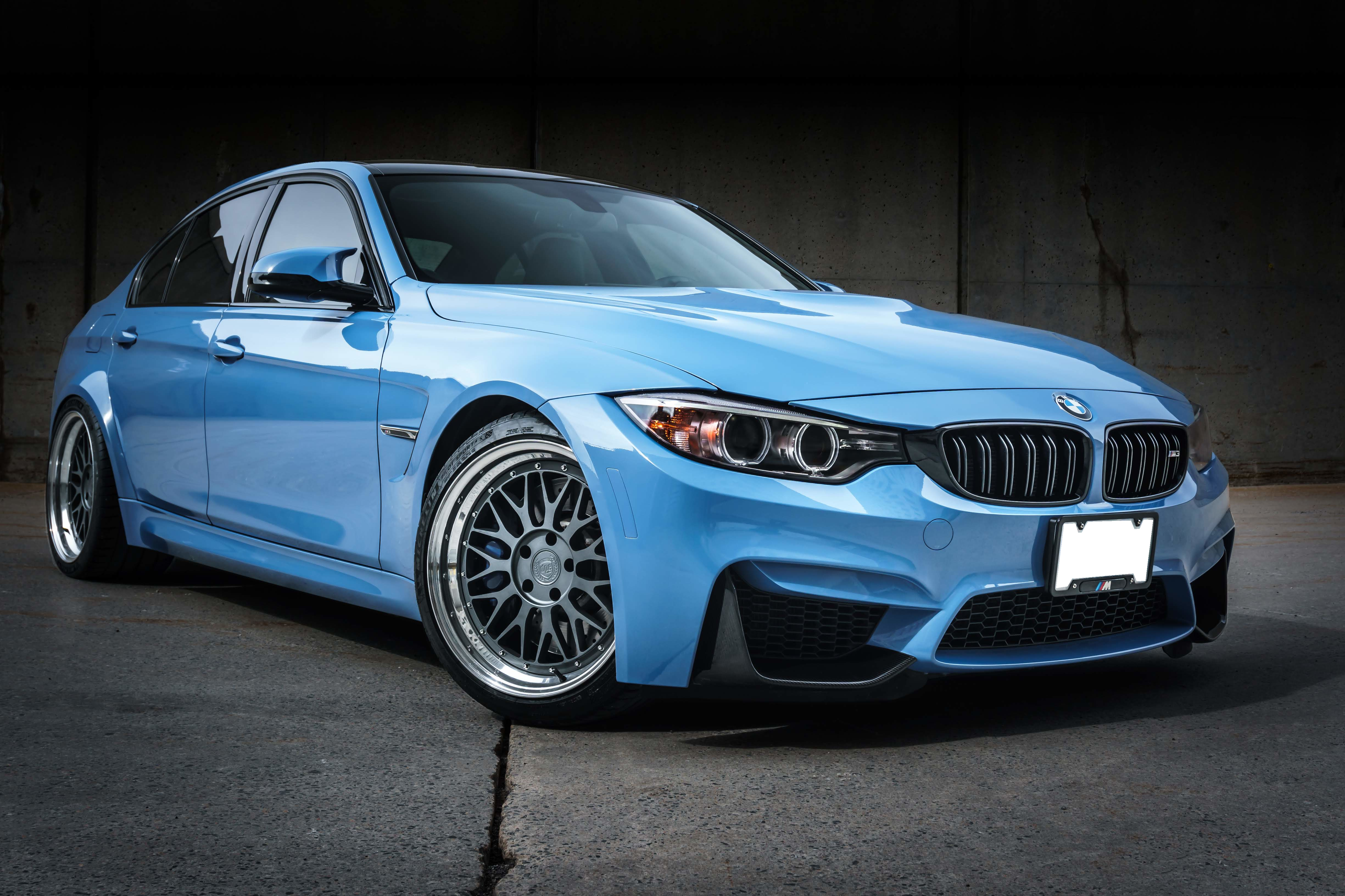 This Blue BMW M3 F80 is running 19-inch DPE RD22 wheels. Paired with 255/35/19 fronts tires. Suspension is Swift lowering springs.