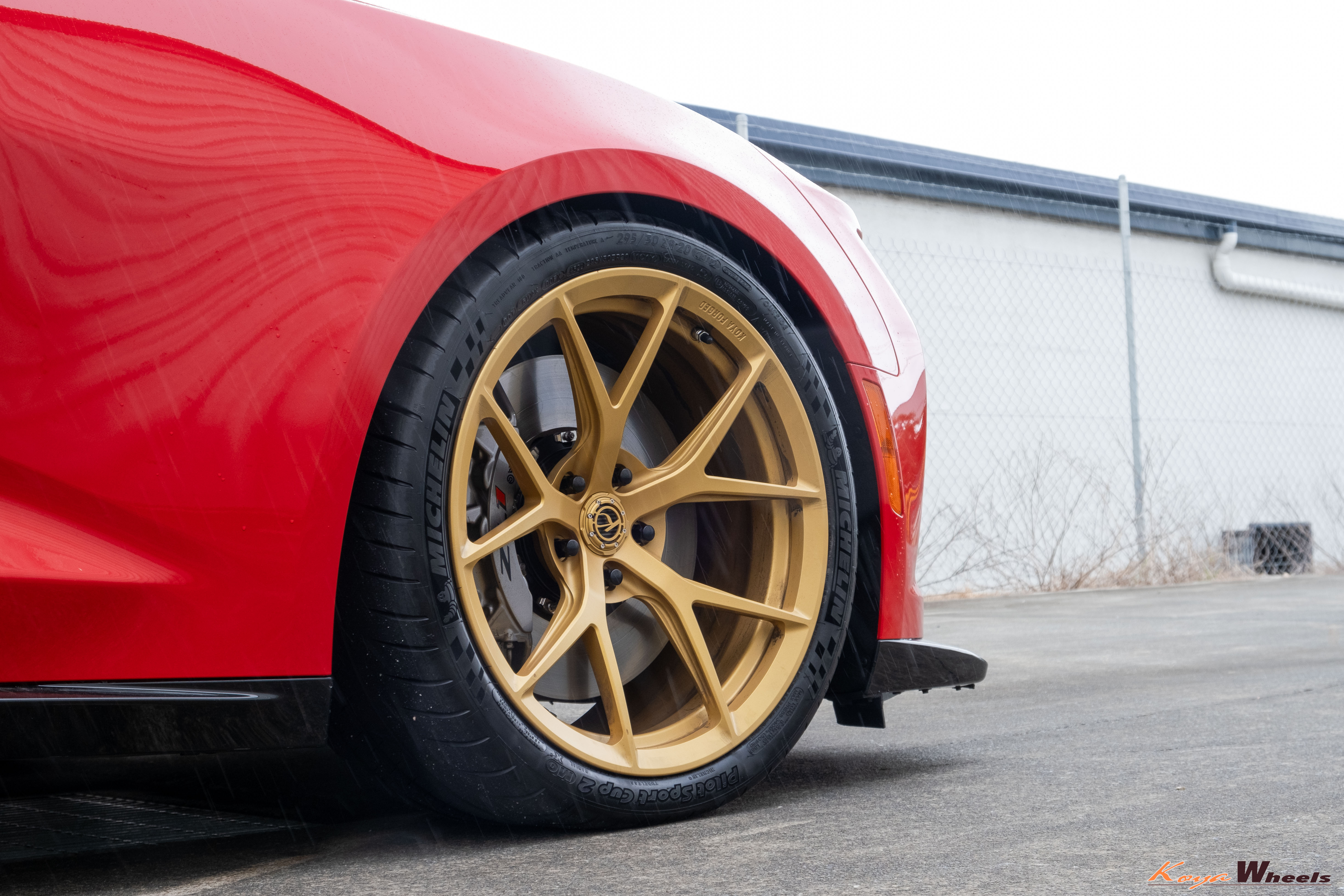 Satin gold finish offers a striking contrast against the vibrant red exterior paintwork. This specific staggered fitment enhances traction and creates a wide, planted stance for performance.