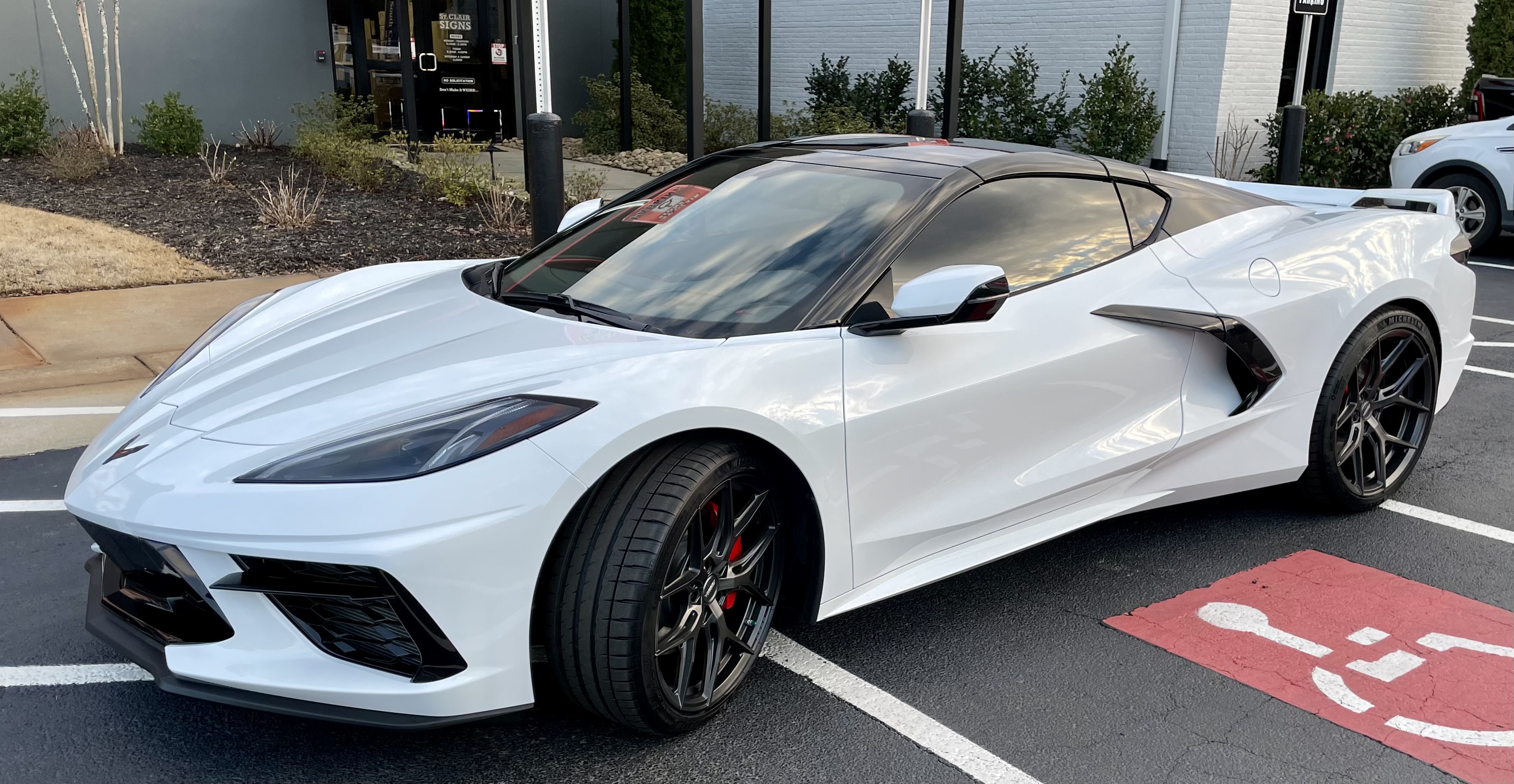 This White Chevrolet Corvette C8 Stingray is running 19×8.5 and 20×11-inch Forgeline Flow Formed F01 wheels finished in Anthracite.