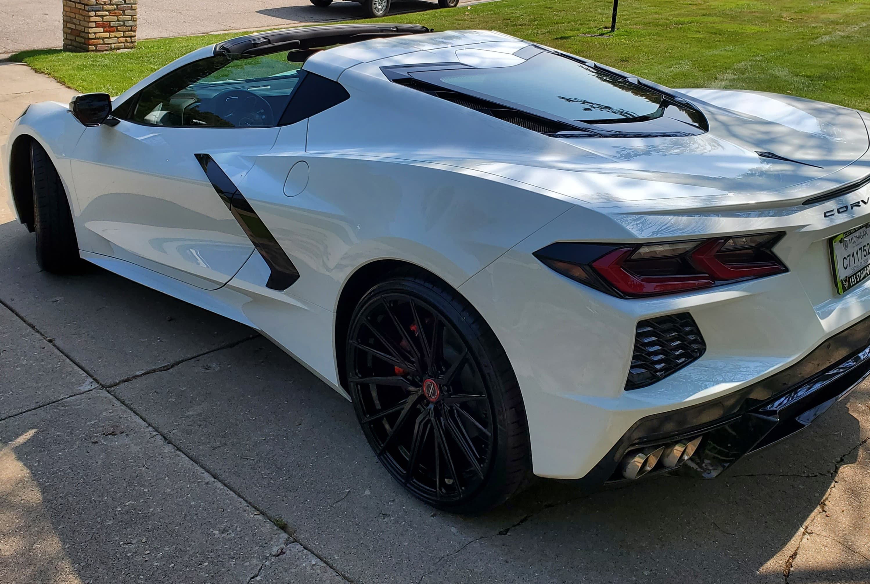 The staggered 20 and 21-inch setup fills the wheel arches with precision. Anthracite finishes against white paint create a sharp, high-contrast visual balance. This build successfully bridges the gap between raw performance and street-oriented elegance. It remains a masterclass in restrained aftermarket curation for the modern Corvette.
