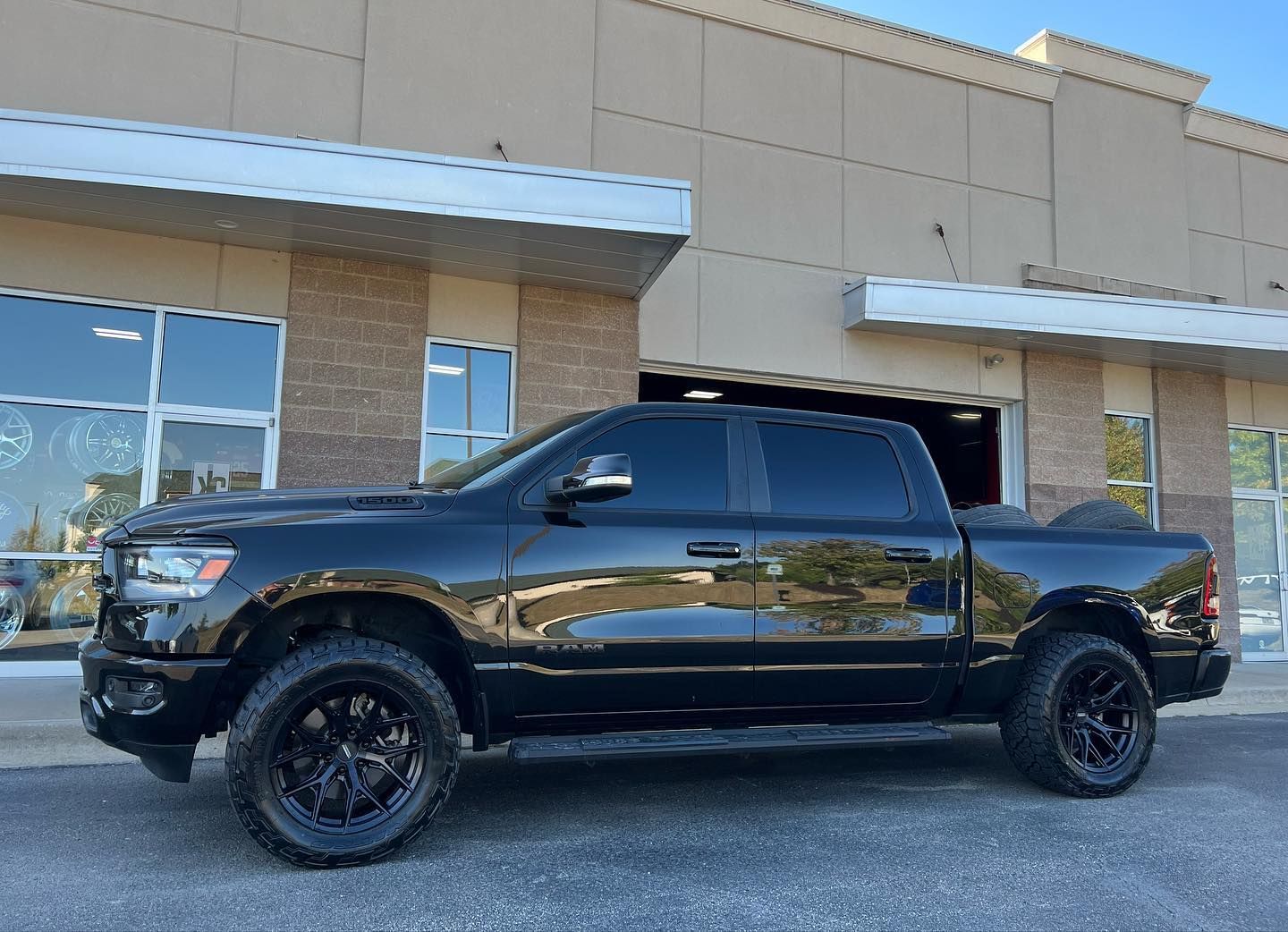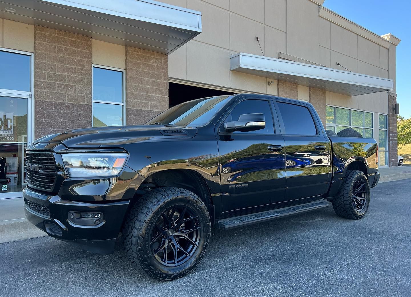 This Black Dodge Ram is running 22×10-inch Fuel Off-Road Flame 6 D804 wheels finished in Matte Black. Paired with 305/45/22 tires.