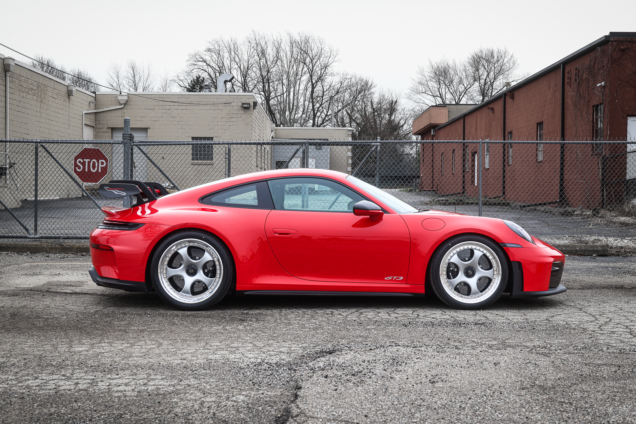 This Red Porsche 911 GT3 992 is running 20×9.5 21×12-inch BC Forged KL01 wheels finished in Crystal Burgundy. Suspension is stock.