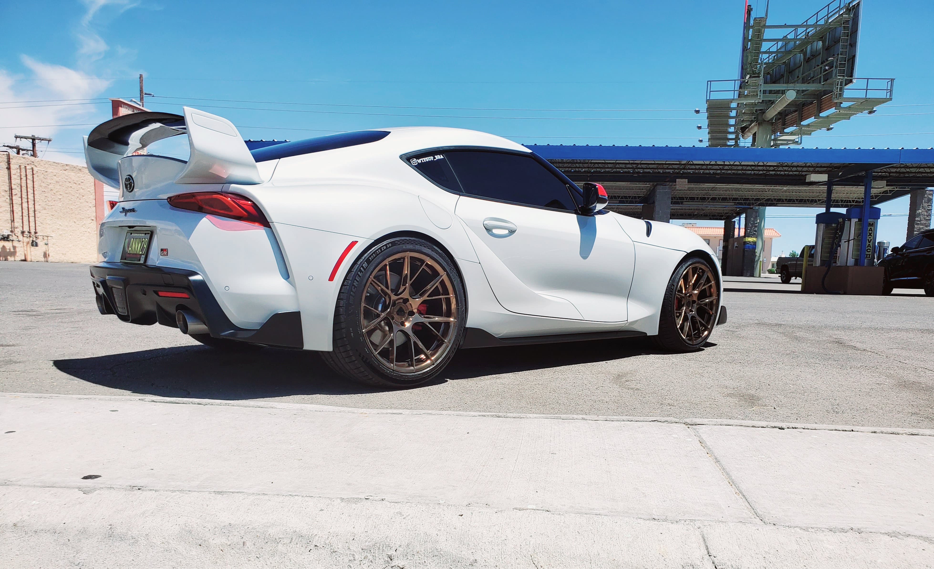 This White Toyota Supra GR is running 19×10 and 19×11-inch Variant Xenon wheels finished in Satin Bronze. Paired with 265/35/19 and 305/30/19 tires.