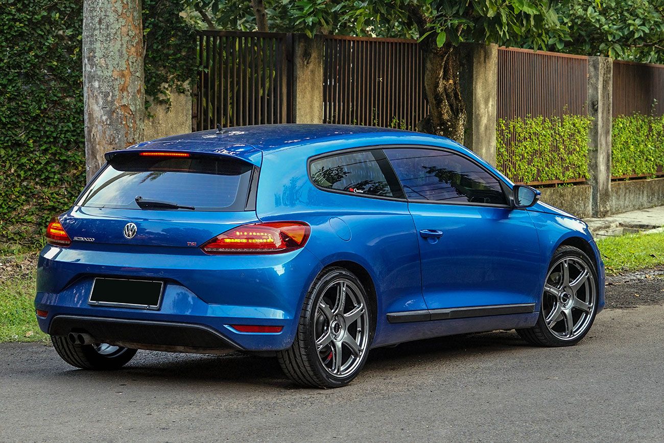 The Volkswagen Scirocco wears a deep blue coat with effortless grace. Matte black Rays Volk Triniti-V wheels ground the sleek frame perfectly.