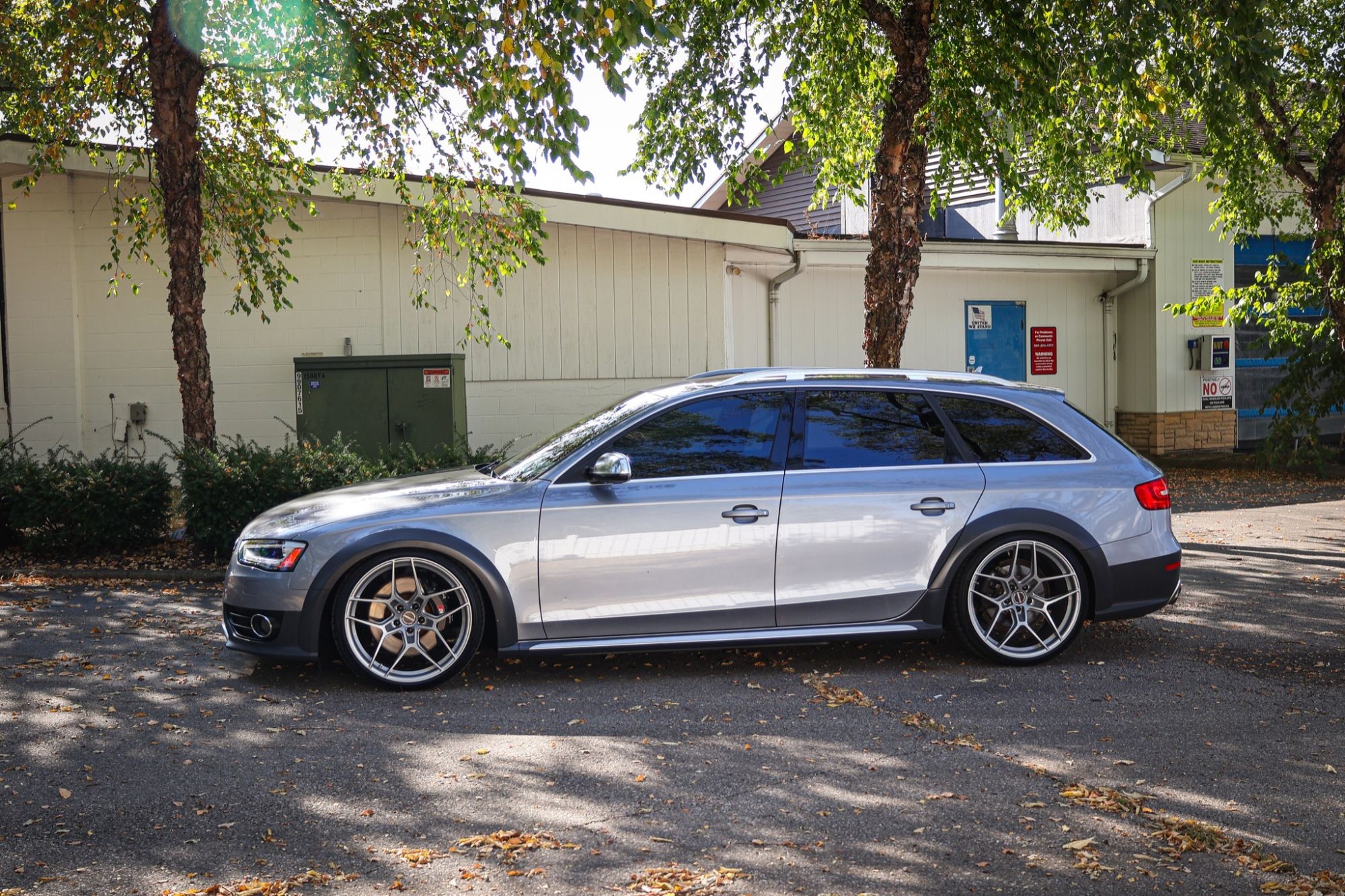 Frankenwagon. Chris Mentrup and the team at Volkswizard turned this Audi Allroad wagon into a monster by swapping the remains of a wrecked Audi S4 into a full conversion, including drivetrain, brakes, and interior. It rides on Air Lift Performance suspension and 20x9.5 Forgeline one piece forged monoblock VV1R wheels finished in Metallic Silver with the optional Carbon Fiber Center Caps! See more at: https://www.forgeline.com/customer-gallery-chris-mentrup/cgk2865