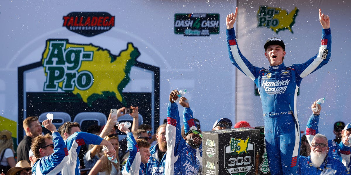 Hendrick Motorsports hadn’t won a race with a full-time driver in NASCAR’s second-tier series since Kyle Busch was a rookie in 2004. That drought ended Saturday at Talladega Superspeedway when 20-year-old Corey Day drove his No. 17 Chevrolet to the yellow and checkered flags on the final lap of the Ag-Pro 300.