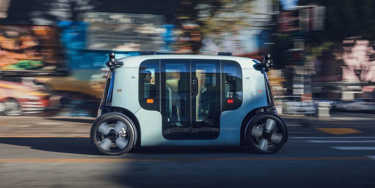 Zoox’s purpose-built vehicle is the most radical hardware play of the three. At 142.9 inches long — shorter than a Fiat 500e — it’s symmetrical front to back. Each end carries its own 67-kWh battery, 134-hp motor, and steering system, building in full redundancy.