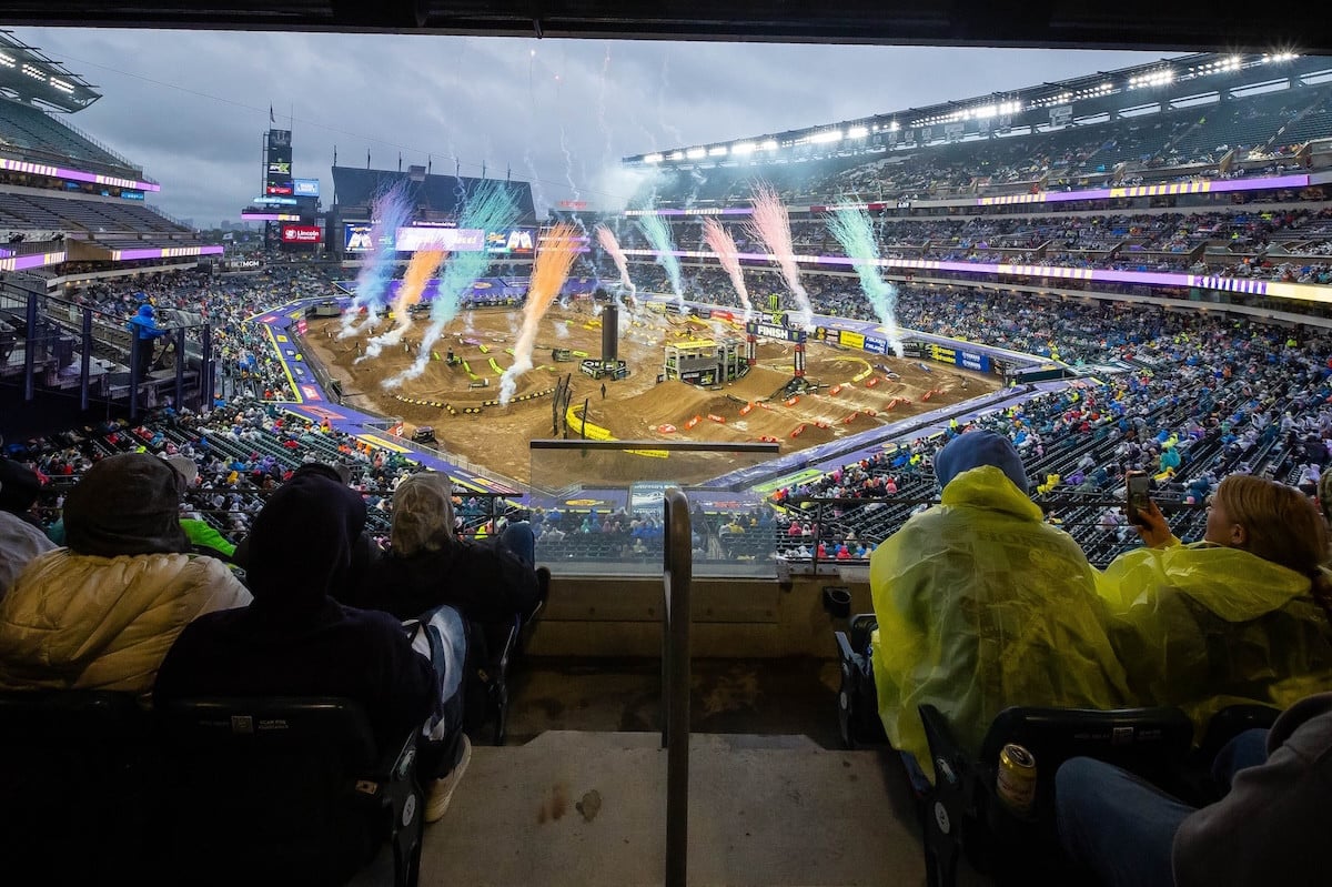 Philadelphia’s Lincoln Financial Field turned into a swamp Saturday night. Intermittent rain saturated the track, forcing race direction to shorten the 450SX main event to 17 minutes plus one lap. Only four riders finished on the lead lap, which tells you everything about the conditions.
