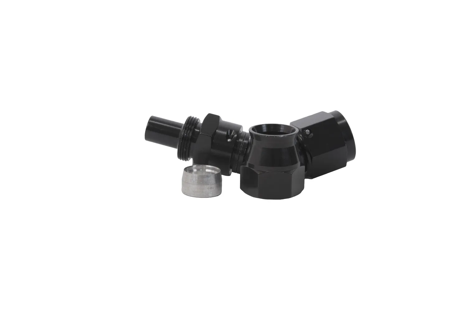 Fitting – Hose End – PTFE Racing Hose – 45 Degree – 8 AN Hose to 8 AN Female Swivel – Aluminum – Black Anodized – Each