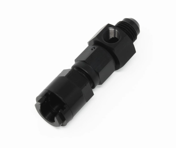 Fitting – Legacy VaporWorx – Fuel Line Adapter – Straight – 6 AN Male to 3/8 in Female Quick Disconnect – 1/8 in NPT Port – Screw-In End Cap – Aluminum – Black Anodized – Each