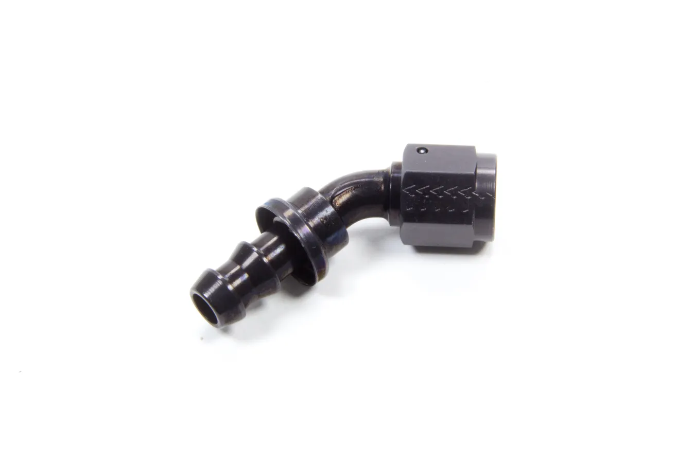 Fitting – Hose End – AQP Socketless – 45 Degree – 6 AN Hose Barb to 6 AN Female – Aluminum – Black Anodized – Each