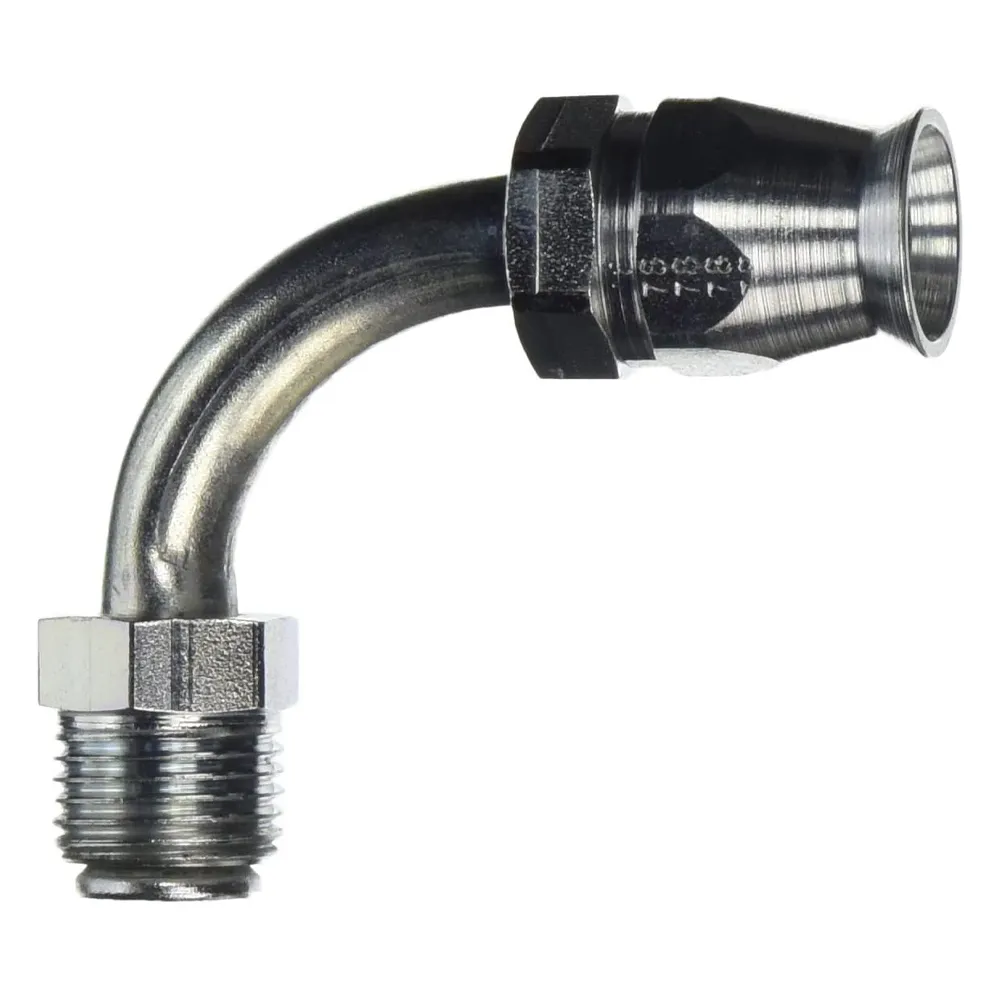 Fitting – Hose End – PTFE Racing Hose – 90 Degree – 6 AN Hose to 5/8-18 Inverted Flare Male – Steel – Natural – Each
