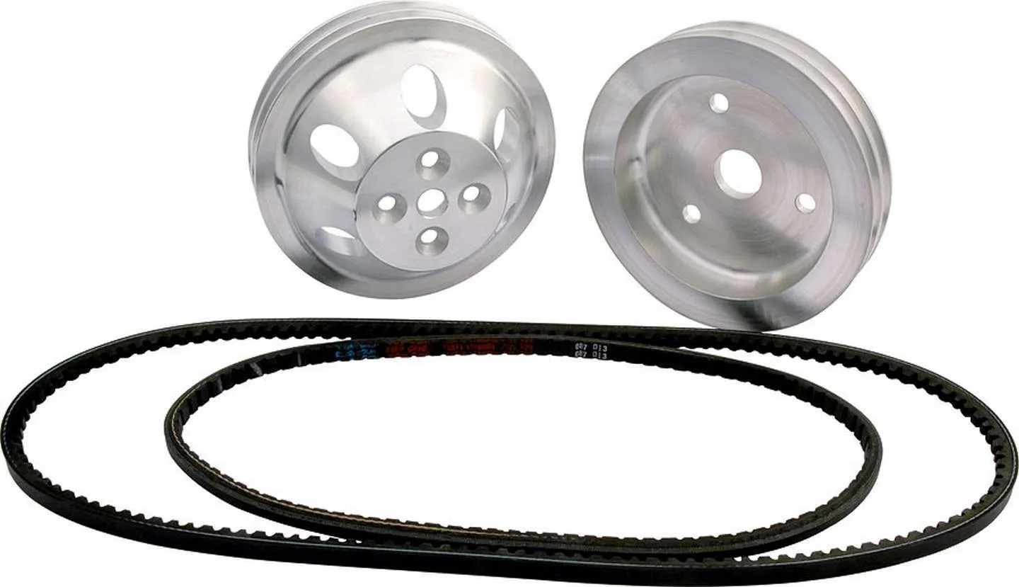THE WATER PUMP PULLEY IN THIS KIT IS DESIGNED TO BE USED ON A 5/8 DIAMETER SHAFT WATER PUMP WITH A BLOCK MOUNTING FLANGE TO PULLEY MOUNTING FLANGE MEASUREMENT OF 5-5/8.Kit includes the following components: ALL31084 1:1 Crank Pulley ALL31085 1:1 Water Pump Pulley ALL86121 V-Belt 34 ALL86125 V Belt 44