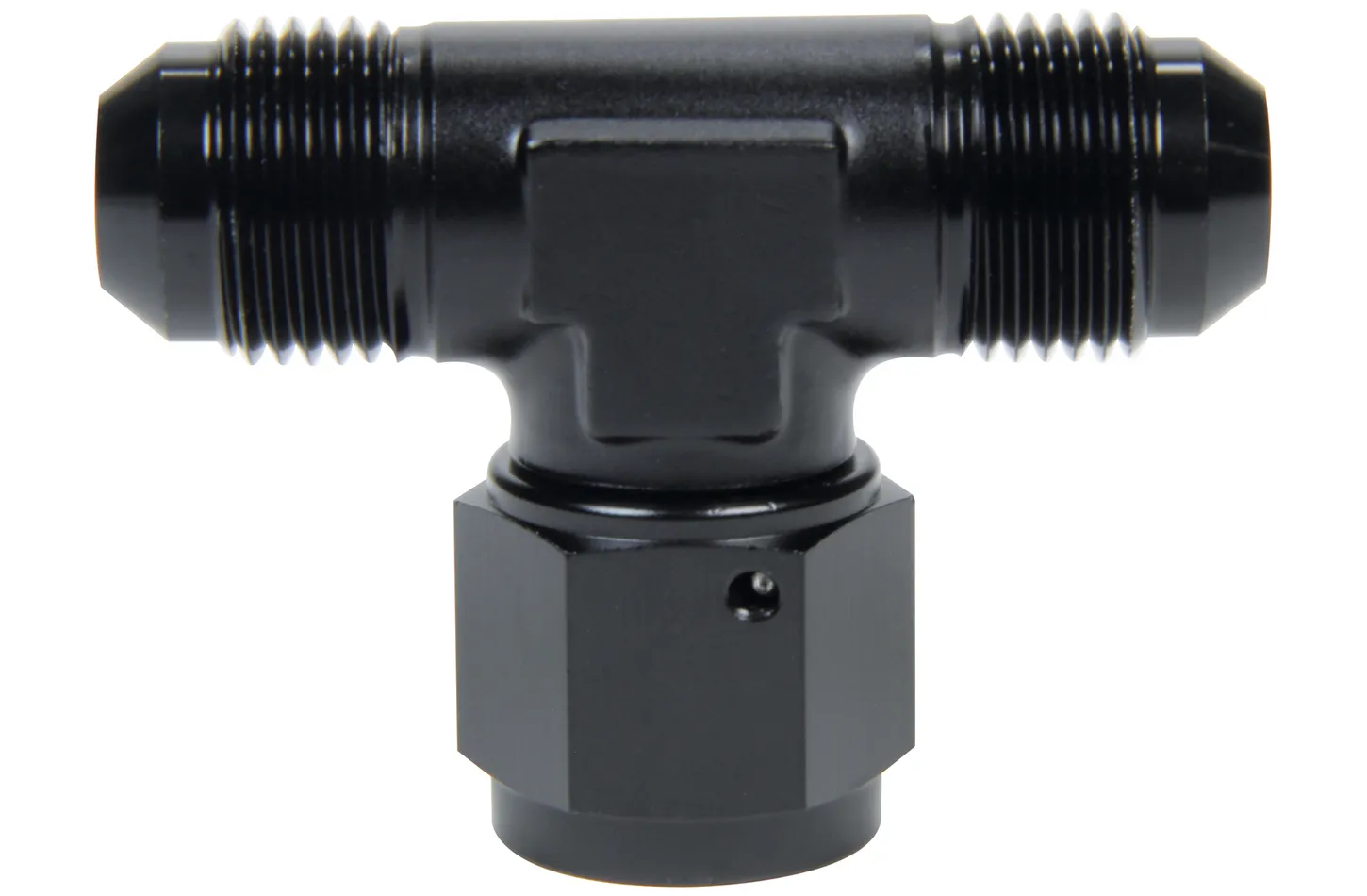 Fitting – Adapter Tee – 8 AN Female Swivel x 8 AN Male x 8 AN Male – Aluminum – Black Anodized – Each