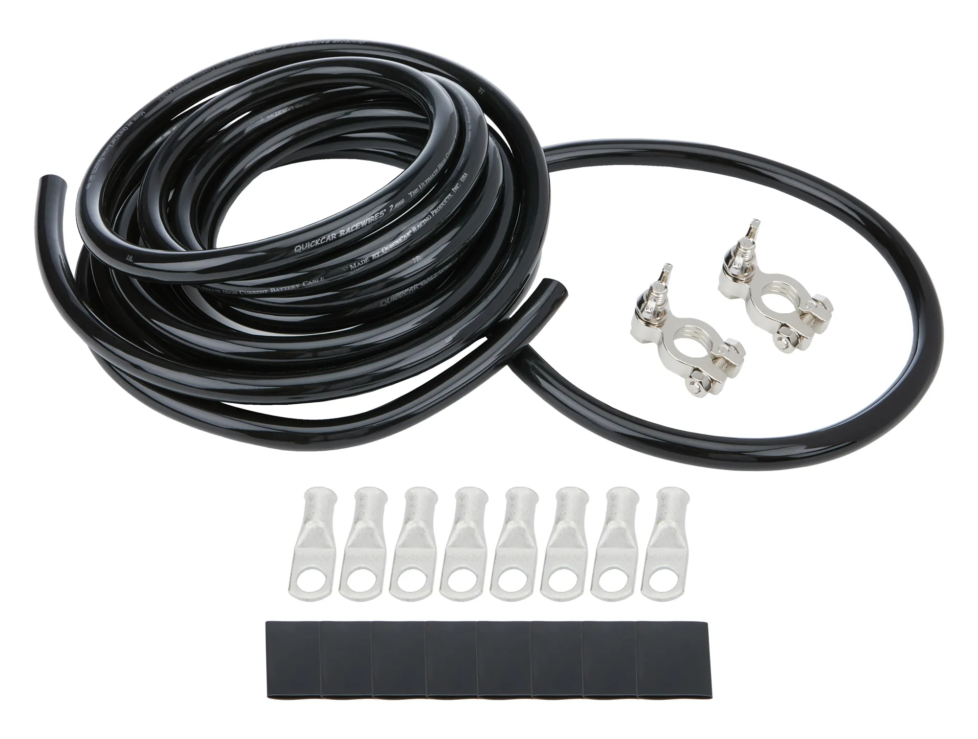 THIS KIT INCLUDES: 15 FT OF BLACK 2 GAUGE CABLE, 2 FT OF BLACK 2 GAUGE CABLE, 4PC OF 5/16 RING TERMINALS W/HEAT SHRINK, 4PC OF 3/8 RING TERMINALS W/HEAT SHRINK, 1 PAIR OF BATTERY TERMINALS. Cable O.D.- 1/2