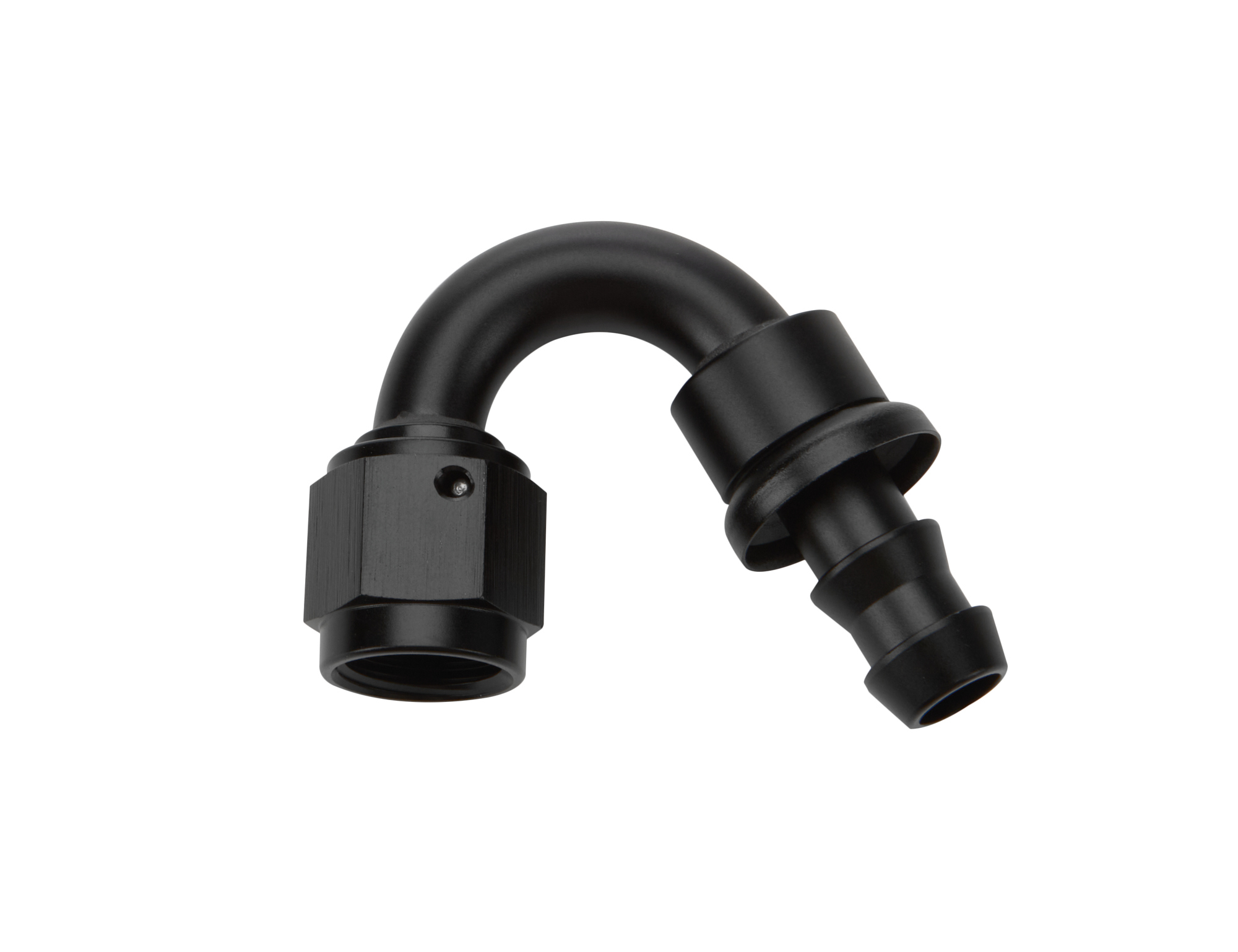 Fitting – Hose End – 150 Degree – 6 AN Hose Barb to 6 AN Female – Aluminum – Black Anodized – Each