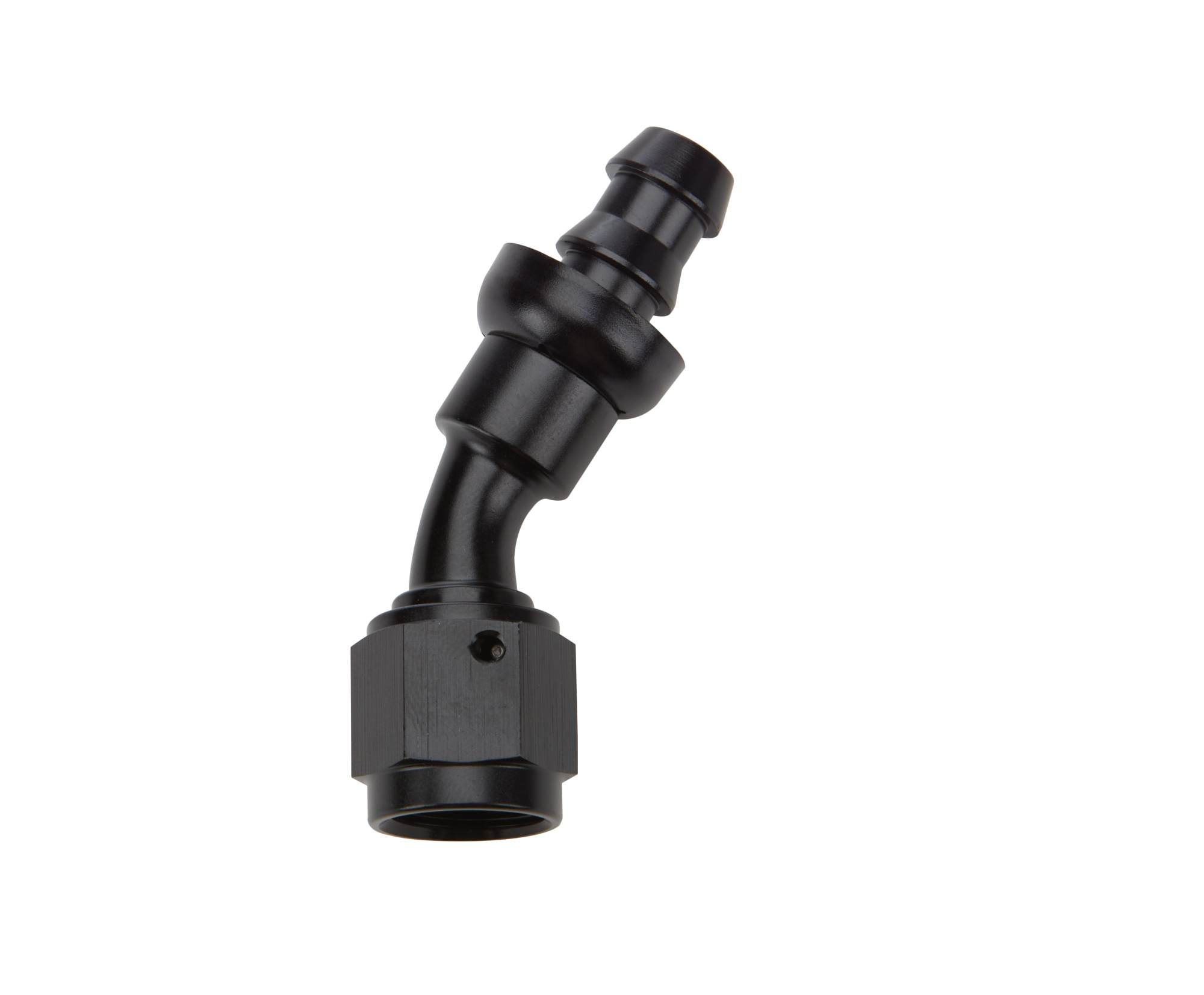 Fitting – Hose End – 30 Degree – 6 AN Hose Barb to 6 AN Female – Aluminum – Black Anodized – Each