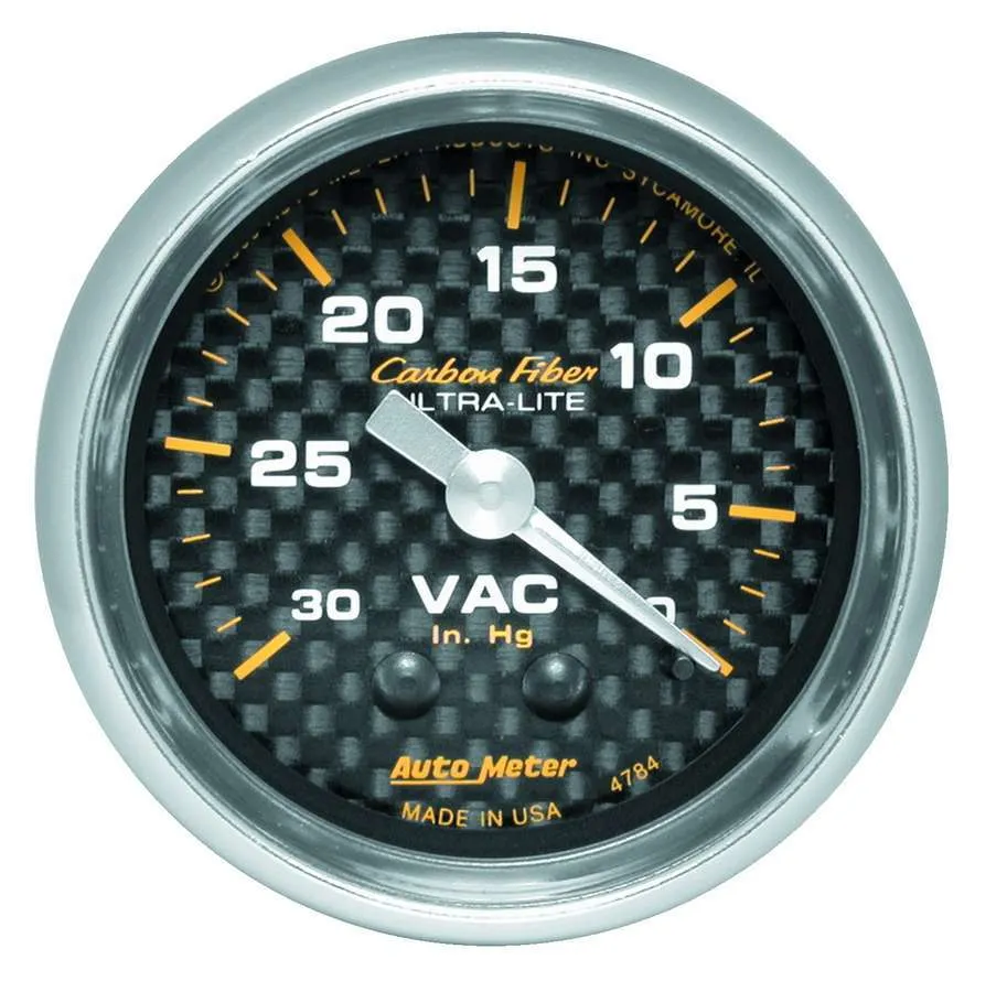 Vacuum Gauge – Carbon Fiber – 0-30 in HG – Mechanical – Analog – 2-1/16 in Diameter – Carbon Fiber Look Face – Each