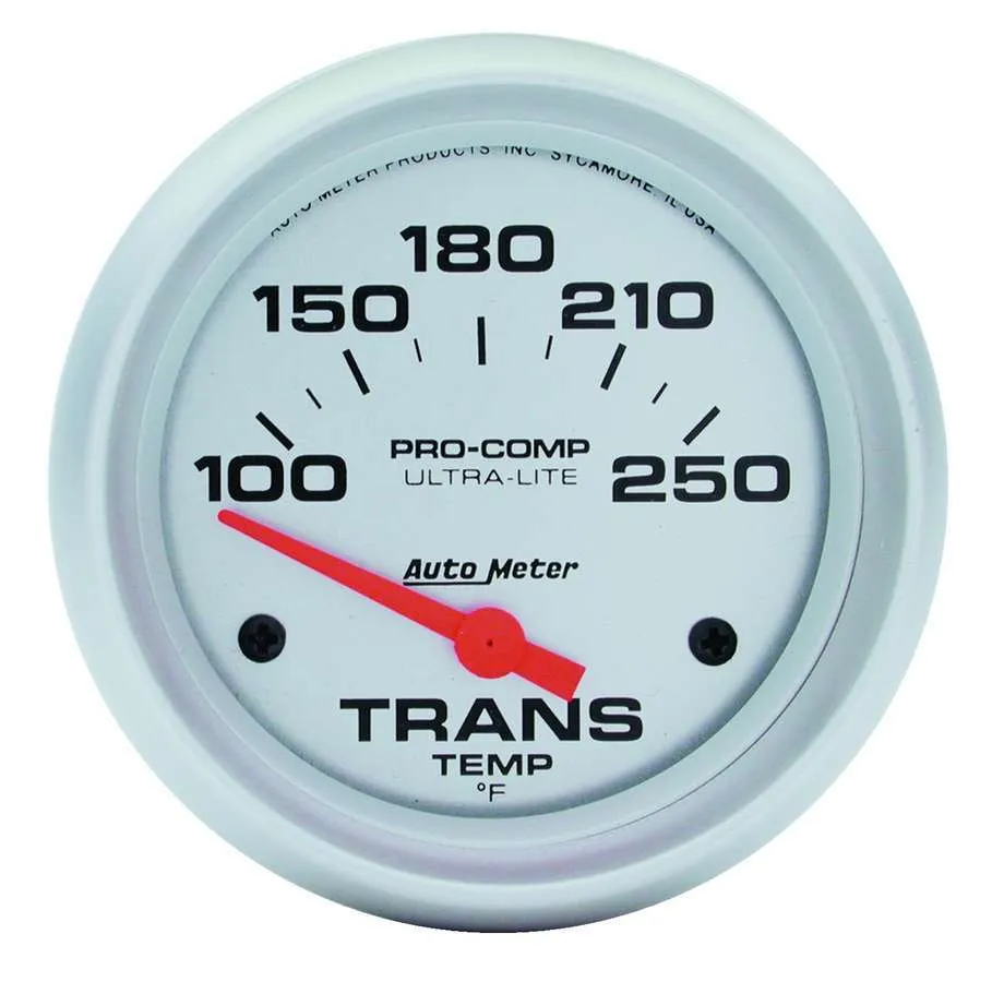 Transmission Temperature Gauge – Ultra-Lite – 100-250 Degree F – Electric – Analog – Short Sweep – 2-5/8 in Diameter – Silver Face – Each
