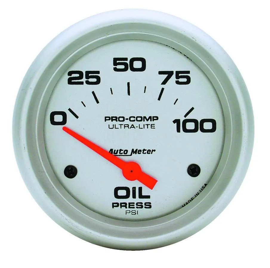 Oil Pressure Gauge – Ultra-Lite – 0-100 psi – Electric – Analog – Short Sweep – 2-5/8 in Diameter – Silver Face – Each