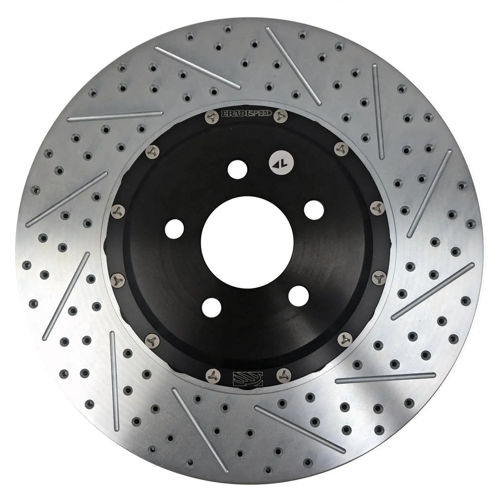 Brake Rotor – EradiSpeed + – Front – Directional / Drilled / Slotted – 15.000 in OD – 2-Piece – Iron – Zinc Plated – Ford Mustang 2015-16 – Pair