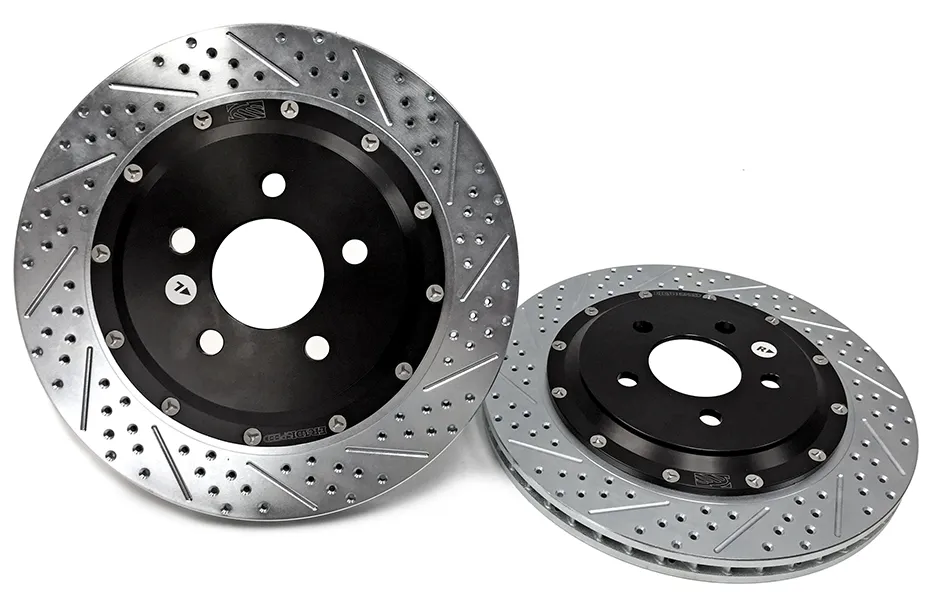 Brake Rotor – EradiSpeed + – Rear – Directional / Drilled / Slotted – 13.000 in OD – 2-Piece – Iron – Zinc Plated – Ford Mustang 2015-16 – Pair