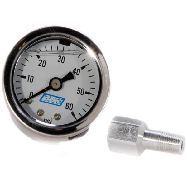 Fuel Pressure Gauge – 0-60 psi – Mechanical – Analog – 1-1/2 in Diameter – Liquid Filled – Full Sweep – 1/8 in NPT Port – Adapter Included – White Face – Kit