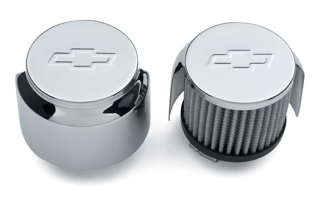 Breather – Clamp-On – Round – 1-3/8 in OD Tube – Filtered – Half Shielded – Chevy Bowtie Logo – Steel – Chrome – Pair
