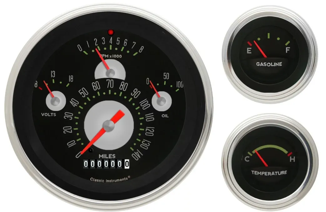 Gauge Kit – 1957 Chevy Package – Analog – Fuel Level / Oil Pressure / Speedometer / Tachometer / Voltmeter / Water Temperature – Black Face – Kit