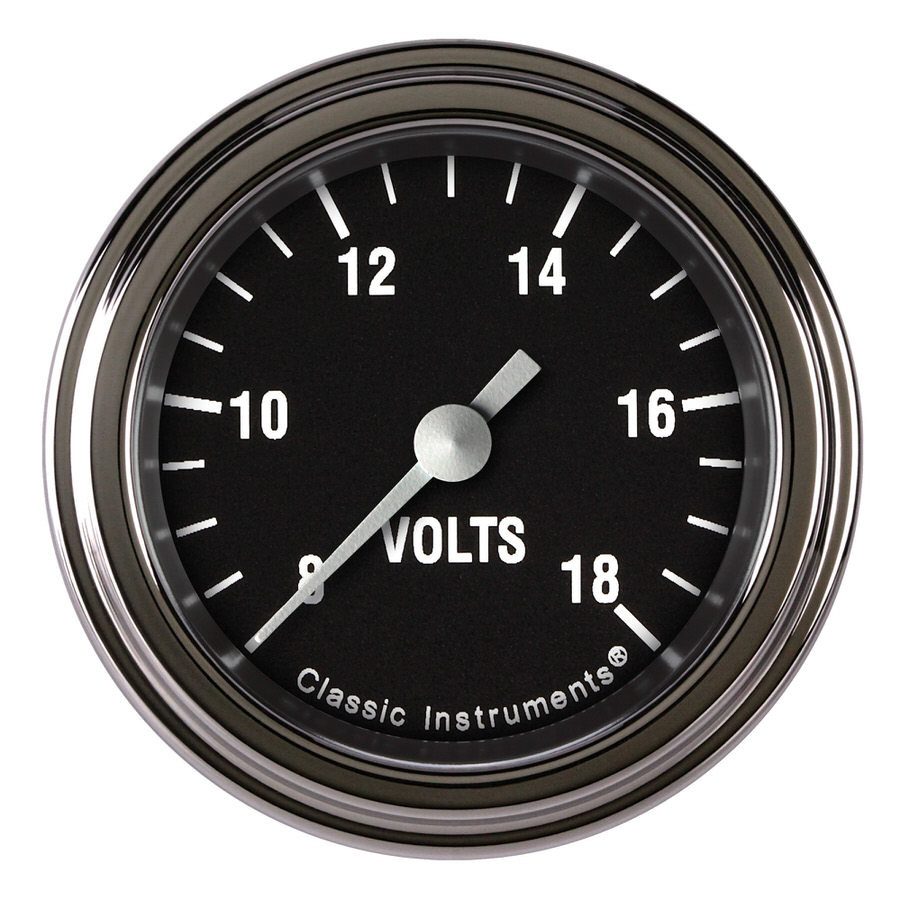 Voltmeter – Hot Rod – 8-18 Volts – Electric – Analog – Full Sweep – 2-1/8 in Diameter – Low Step Stainless Bezel – Flat Lens – Black Face – Each