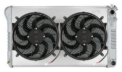 Radiator and Fan – 34.21 in W x 18.82 in H x 3 in D – 14 in Fans – Passenger Side Inlet – Passenger Side Outlet – Aluminum – Polished – Automatic – GM LS-Series – GM A-Body 1968-77 – Kit