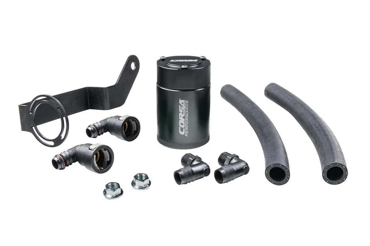 Air-Oil Separator – 3 oz – 2.375 in Diameter – 3.625 in Tall – 3/8 in NPT Female Inlet / Outlet – Aluminum – Black Anodized – Mopar Gen III Hemi – Dodge Challenger / Charger 2015-22 / Midsize SUV 2021 / Jeep Grand Cherokee 2018-21 – Kit