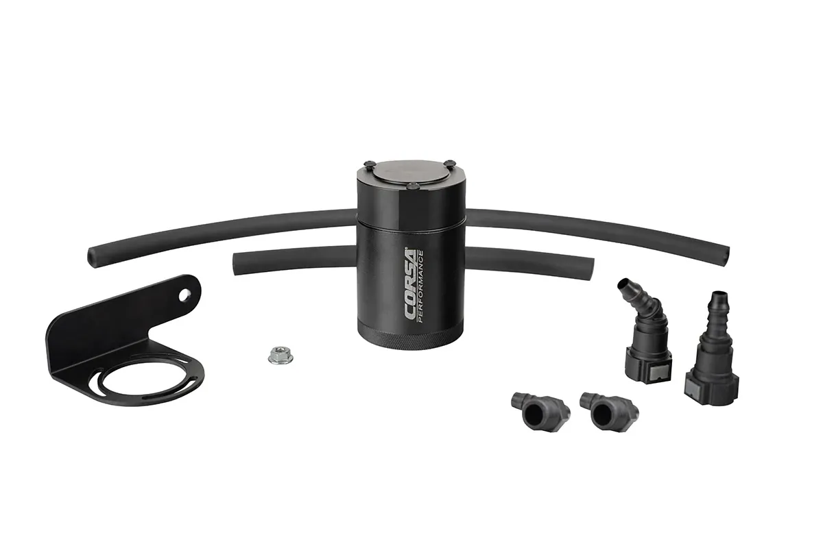 Oil Catch Can – 3 oz – 2.375 in Diameter – 3.625 in Tall – 3/8 in NPT Female Inlet / Outlet – Brackets / Hardware Included – GM Fullsize SUV / Truck 2019-22 – Kit