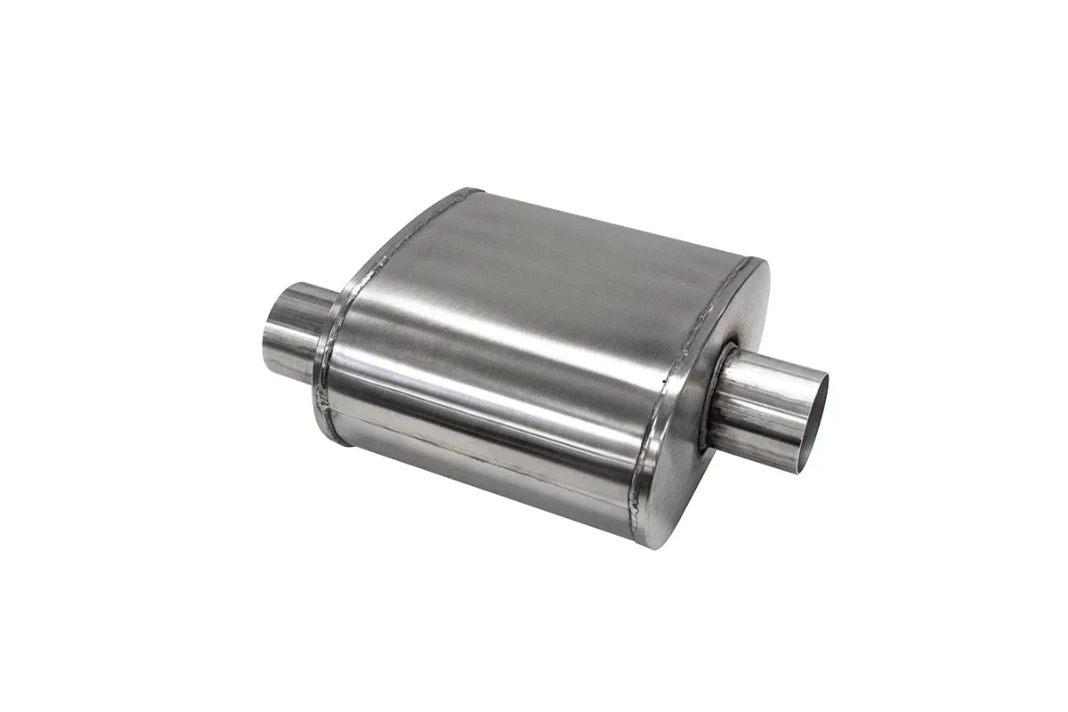 Muffler – Pro Series – 2.5 in Offset Inlet – 2.5 in Center Outlet – 10 x 11 x 6.25 in Oval Body – 16 in Long – Stainless – Natural – Universal – Each