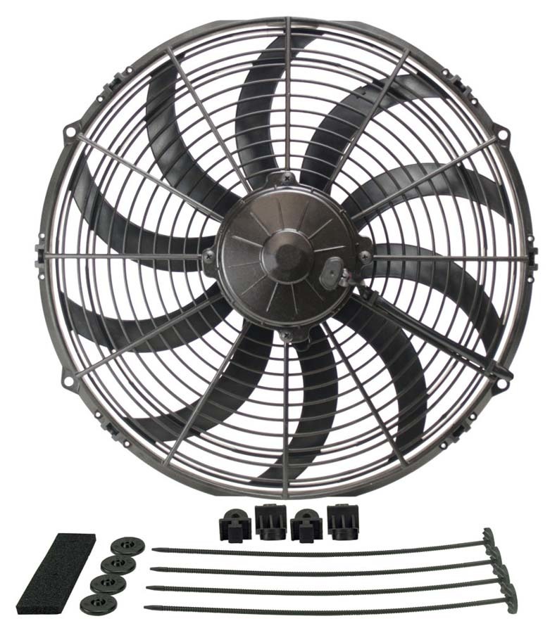 Electric Cooling Fan – High Output – 14 in Fan – Puller – 1864 CFM – 12V – Curved Blade – 15 x 14.5 in – 3.5 in Thick – Install Kit – Plastic – Kit