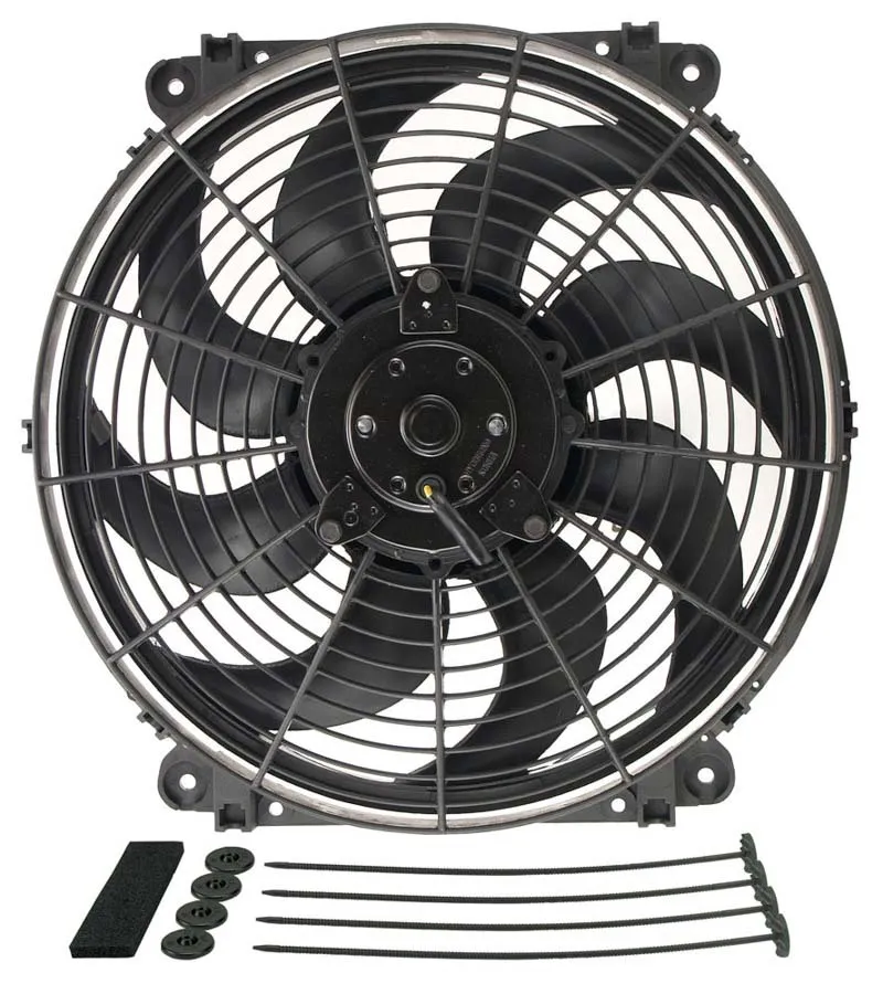 Electric Cooling Fan – Tornado – 14 in Fan – Push / Pull – 1350 CFM – 12V – Curved Blade – 14 x 14.5 in – 3.25 in Thick – Install Kit – Plastic – Kit