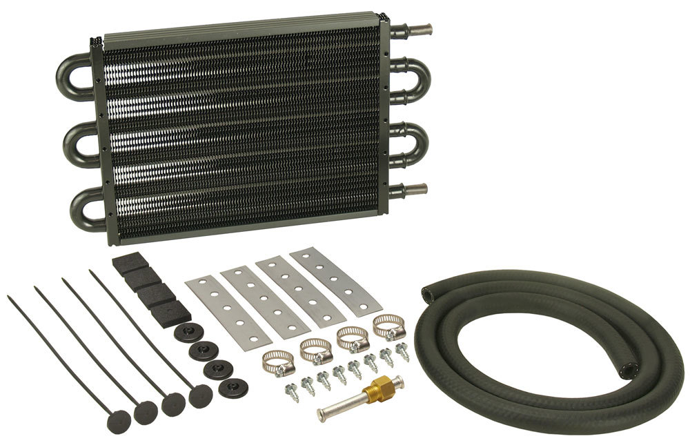 Fluid Cooler – 12.75 x 7.625 x 0.75 in – Tube Type – 11/32 in Hose Barb Inlet / Outlet – Fitting / Hardware / Hose – Aluminum / Copper – Black Powder Coat – Automatic Transmission – Kit