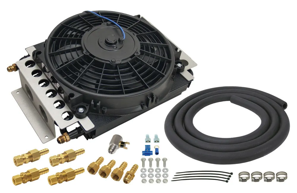 Fluid Cooler and Fan – 15.75 x 11.5 x 5 in – Tube Type – 6 AN Male Inlet / Outlet – Fittings / Hardware / Hose – Aluminum / Copper – Black Powder Coat – Automatic Transmission – Kit