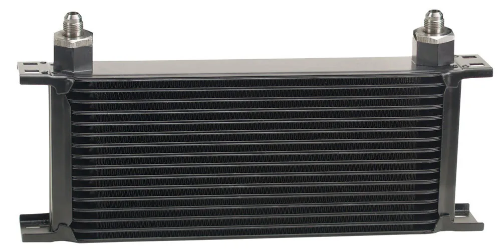 Fluid Cooler – 13 x 6.438 x 2 in – Plate Type – 10 AN Female O-Ring Inlet / Outlet – 6 AN Male Adapters – Aluminum – Black Powder Coat – Universal – Each