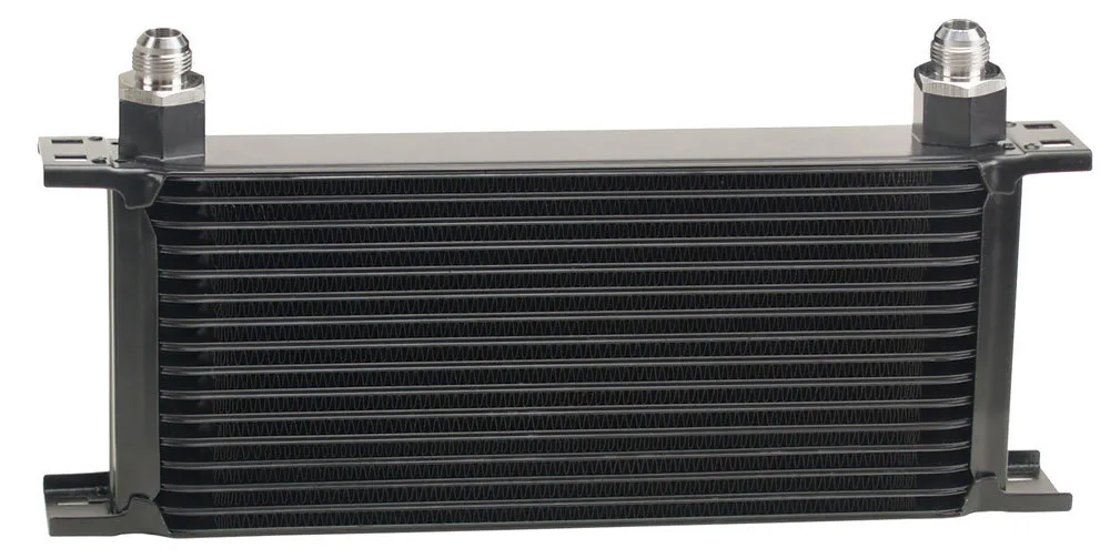 Fluid Cooler – 13 x 6.563 x 2 in – Plate Type – 10 AN Female O-Ring Inlet / Outlet – 8 AN Male Adapters – Aluminum – Black Powder Coat – Universal – Each