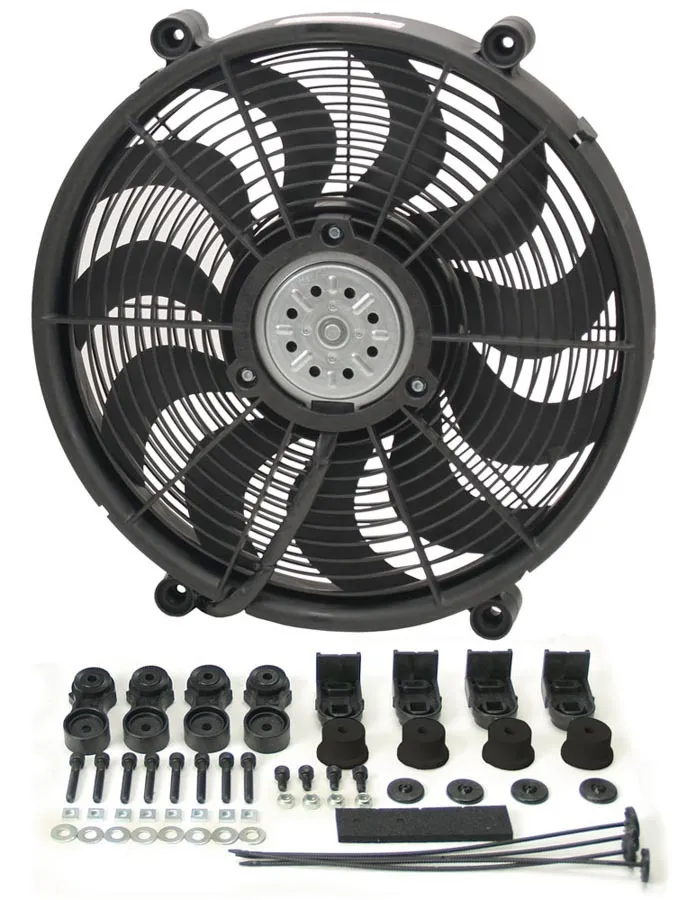 Electric Cooling Fan – HO RAD – 17 in Fan – Push / Pull – 2400 CFM – 12V – Curved Blade – 16.875 x 15.625 in – 2.625 in Thick – Install Kit – Plastic – Kit