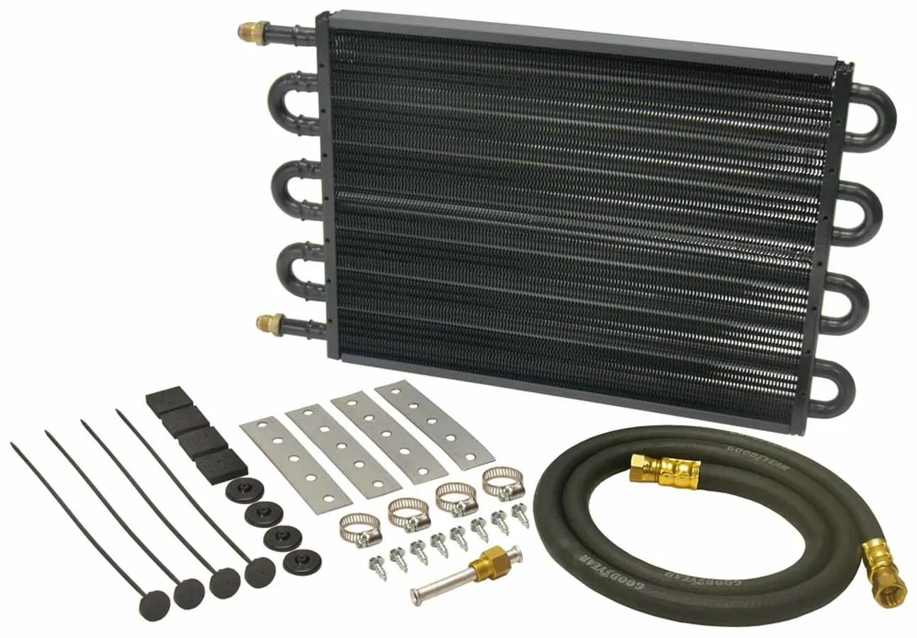 Fluid Cooler – 17.5 x 10.25 x 0.75 in – Tube Type – 6 AN Male Inlet / Outlet – Fitting / Hardware / Hose – Aluminum / Copper – Black Powder Coat – Automatic Transmission – Kit