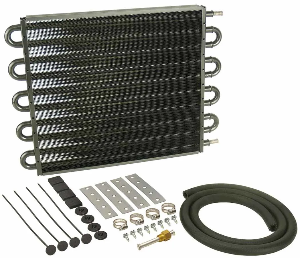 Fluid Cooler – 16.625 x 12.625 x 0.75 in – Tube Type – 11/32 in Hose Barb Inlet / Outlet – Fitting / Hardware / Hose – Aluminum / Copper – Black Powder Coat – Automatic Transmission – Kit
