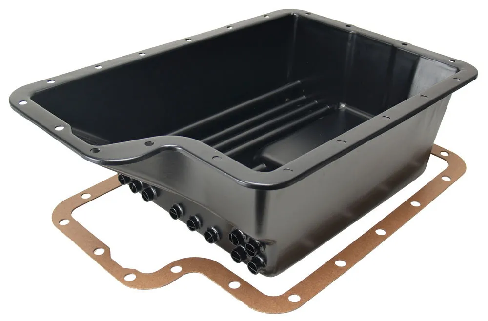 Transmission Pan – Cooling – Deep Sump – Flat – 6.313 in Deep – Adds 7.938 qt Capacity – Steel – Black Paint – 4R100 / E4OD / 5R110 / 5R110W – Each