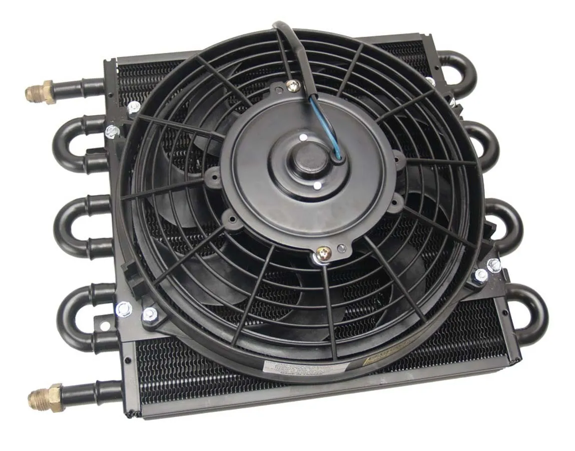 Fluid Cooler and Fan – 13.625 x 10.25 x 3.625 in – Tube Type – 6 AN Male Inlet / Outlet – Aluminum / Copper – Black Powder Coat – Automatic Transmission – Kit
