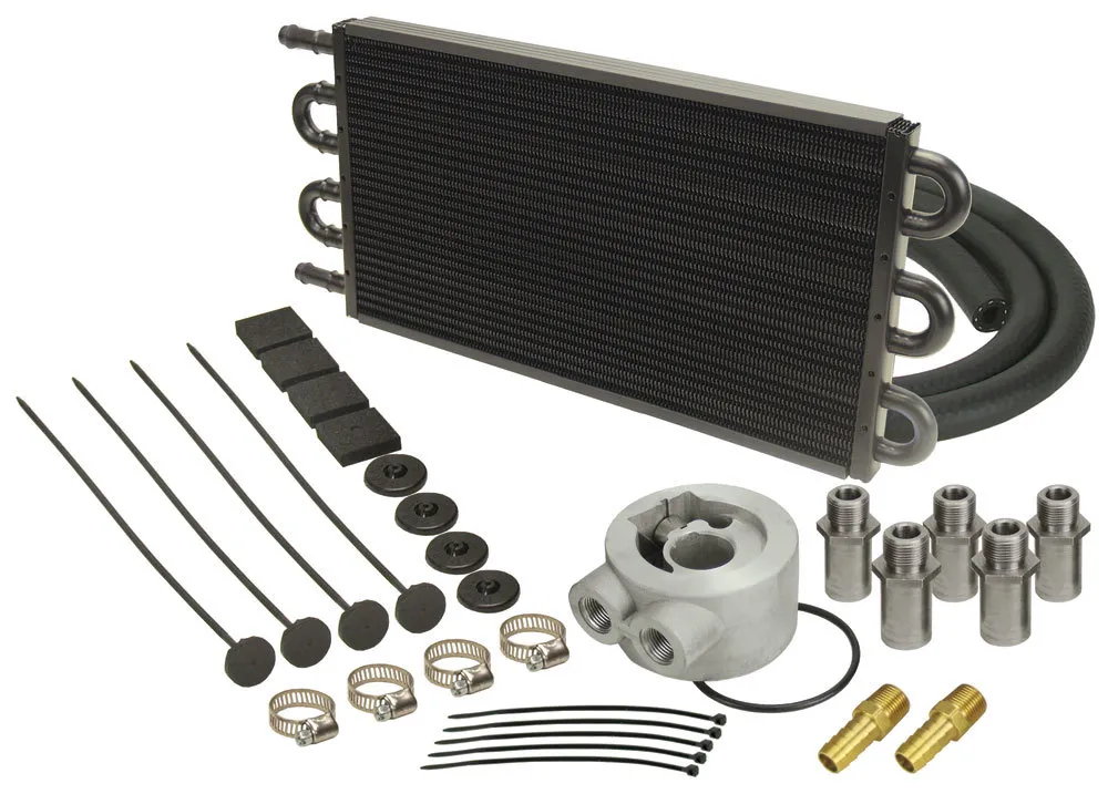 Fluid Cooler – 16.625 x 7.625 x 0.75 in – Tube Type – 1/2 in Hose Barb Inlet / Outlet – Fittings / Hardware / Hose – Aluminum / Copper – Black Powder Coat – Engine Oil – Kit