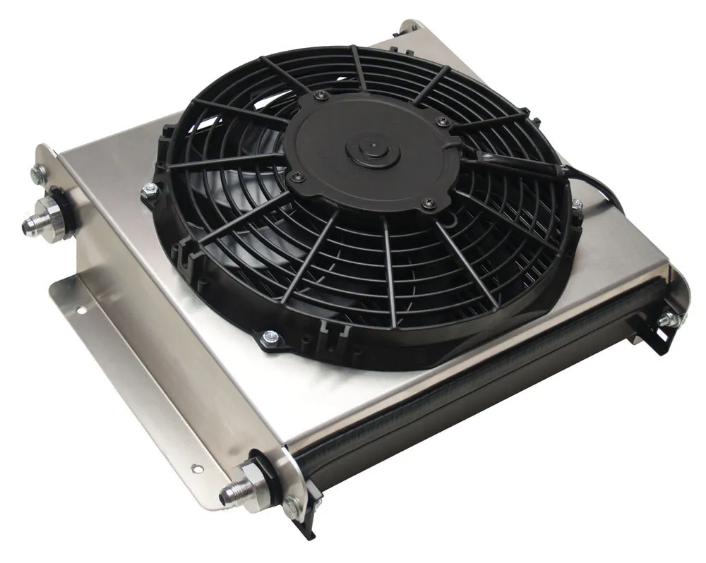 Fluid Cooler and Fan – 14.875 x 13 x 5.625 in – Plate Type – 10 AN Female Inlet / Outlet – 6 AN Male Adapters – Aluminum – Black Powder Coat – Universal – Each
